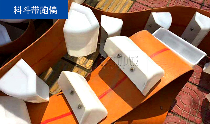 (2)料斗帶接頭不正料斗帶接頭不正是指料斗帶結(jié)合后,料斗帶邊緣線不在同一直線上。工作時(shí),料斗帶一邊緊一邊松,使料斗帶向緊邊側(cè)向移動(dòng),產(chǎn)生跑偏,造成料斗盛料不充分,卸料不,回料增多,生產(chǎn)率下降,嚴(yán)重時(shí)造成料斗帶卡邊、撕裂。這時(shí)應(yīng)停機(jī),修正接頭并接好。