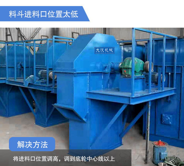 斗式提升機(jī)料斗自行盛取從進(jìn)料口進(jìn)來的物料,如果其進(jìn)料口太低,在導(dǎo)致料斗來不及盛取物料,而物料大部分進(jìn)入機(jī)座,造成料斗舀取物料了,而斗式提升機(jī)提升的物料多為塊狀,就很容易引起料斗變形、脫落。