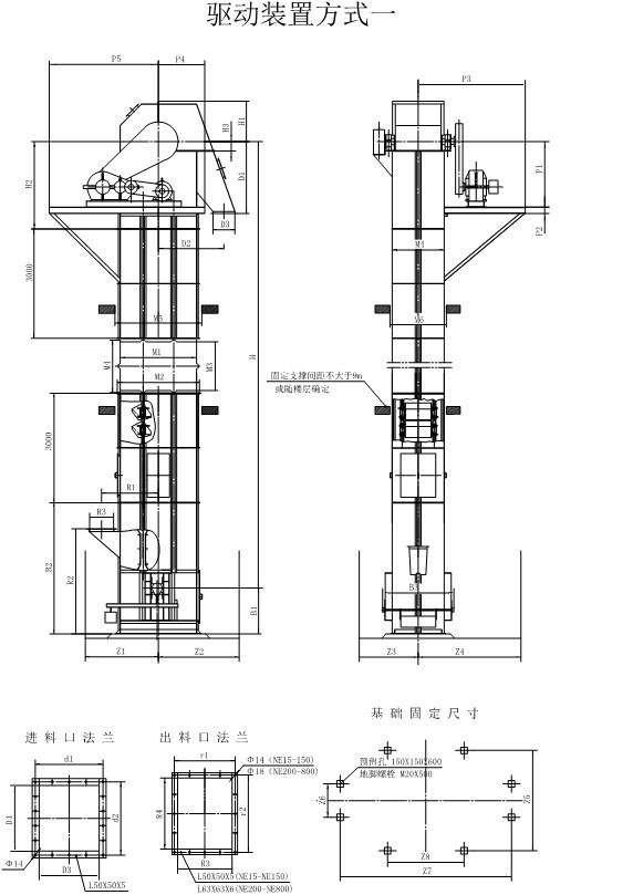 斗式提升機由上部區(qū)段、中部機殼、下部區(qū)段、帶料斗的輸送帶等牽引部件、傳動裝置和室外檢修平臺組成。